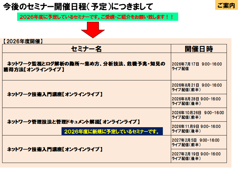 2026年2月6日(金) 9:00-16:00ライブ配信(前半)、2026年2月19日(木) 9:00-16:00ライブ配信(後半)にJUASさんで担当させて頂く、ネットワーク技術入門講座【オンラインライブ】 (4125141)をご案内させて頂きます。